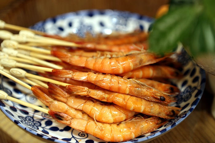 一樣是桃園在地養殖的白蝦,用串燒樣式盛盤,擺飾跟文房四寶一樣也讓人耳目一新,白蝦尺寸不大,但是蝦肉的口感都很彈牙,品質很不賴。 |