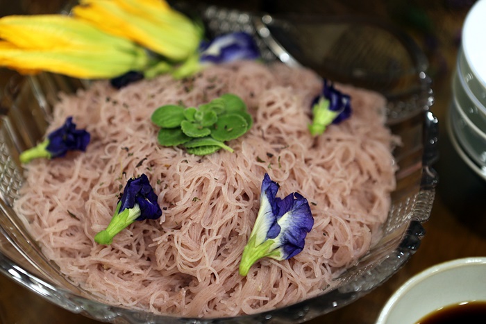 | 很特別的炊粉,剛剛的黑米粉就是這一道跟糖心蛋搭配一套,純米做成的米粉也是桃園在地的得獎米粉,加上特調的醬汁吃起來偏酸甜,米粉因為純米做的,所以滿容易斷裂的,但是吃起來卻是有滿口米香。 |
