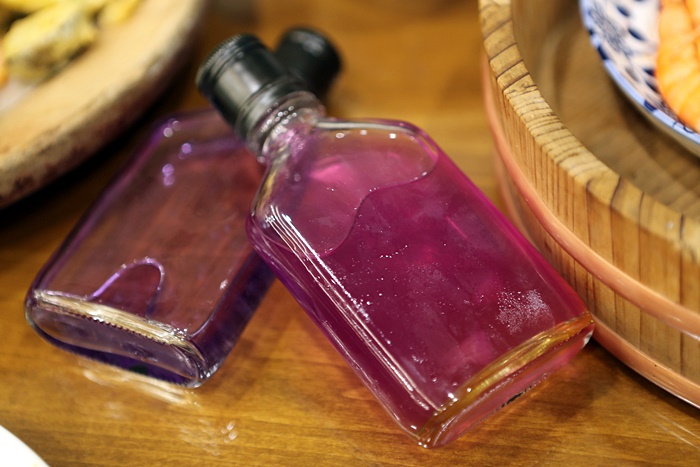 | 還有提供洛神花茶飲用,用很特別的威士忌隨身瓶裝的XDD |