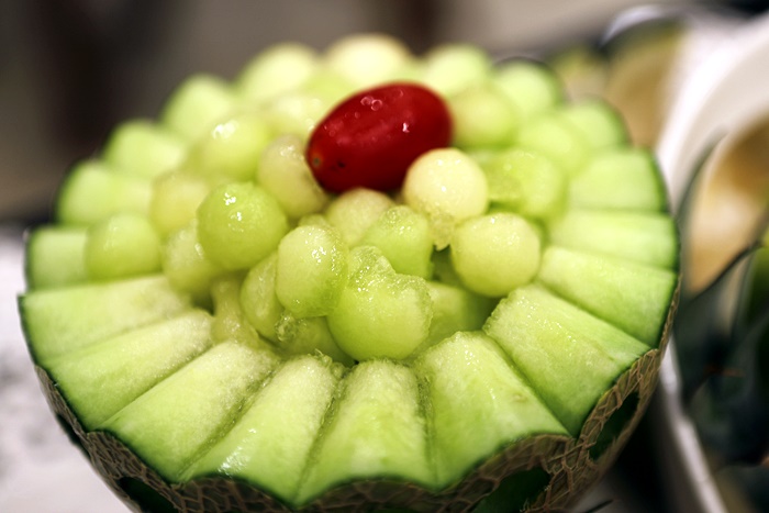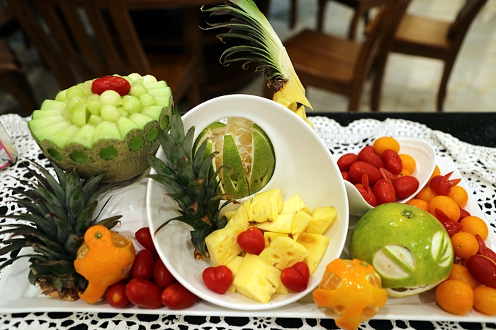 | 最後的水果也非常霸氣,還特別的去做了一些果雕,擺盤一整個就是漂亮無比,水果也都是桃園在地水果,超過五六種的水果可以享用,哈密瓜的甜度也很不錯,真的都是特別挑過當季好吃又甜的水果,吃得很過癮。 |