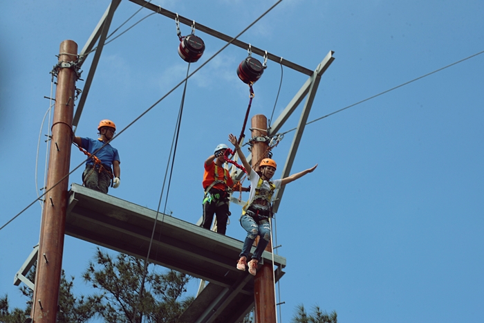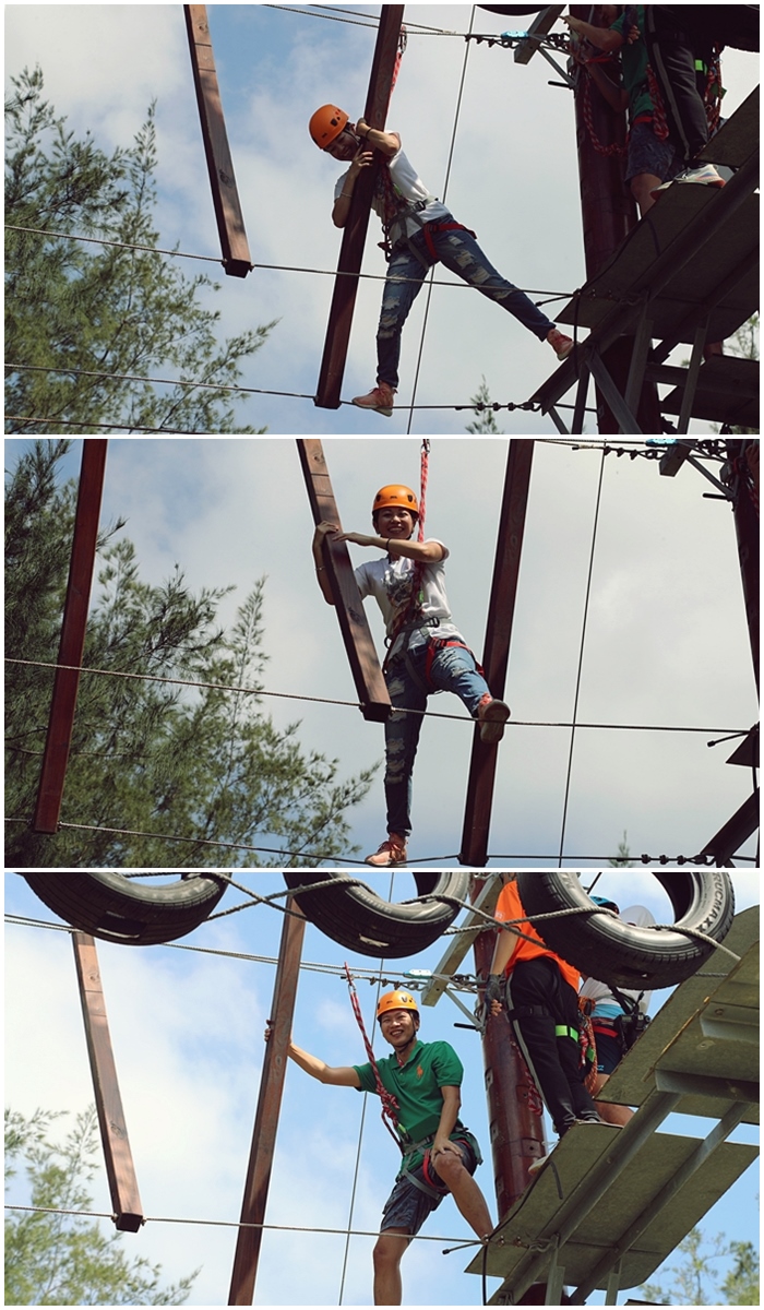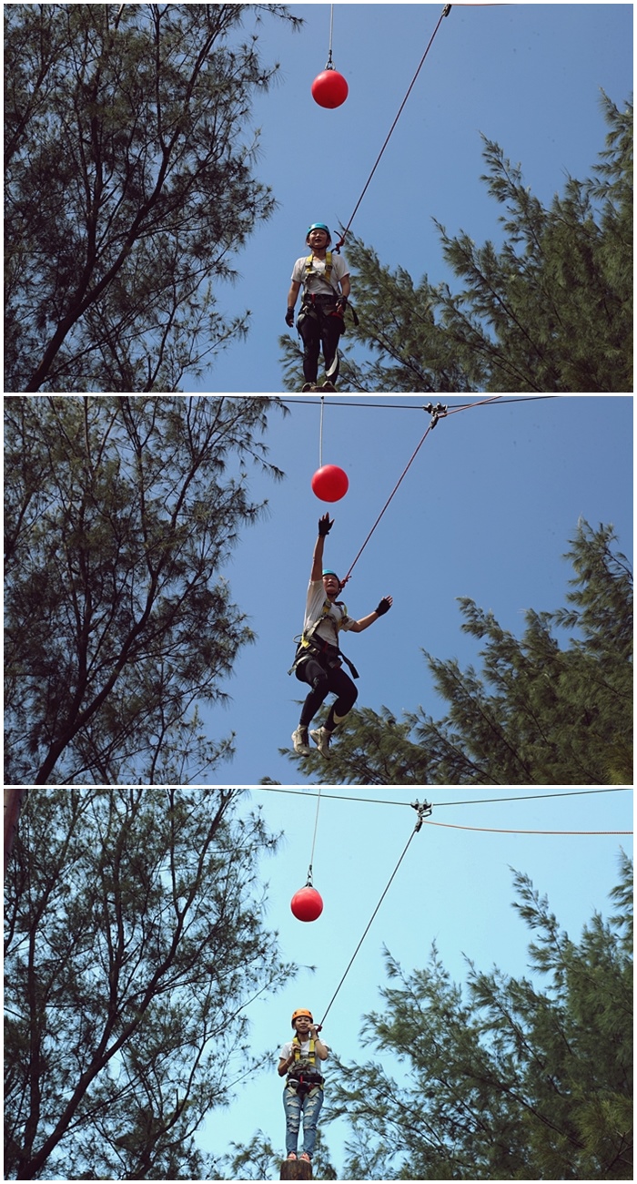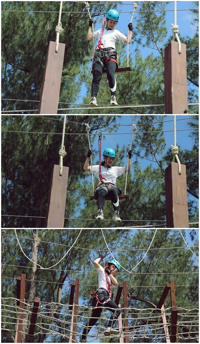 | 女生們本以為自己會驚聲尖叫,但是人生就是這樣,遇到挑戰的時候,整個戰鬥力完全大爆發,加上了解自己的安全無虞後,拚起的衝勁一點都不輸給男生,在高空的鞦韆大夥玩得不亦樂乎,加上團隊合作的默契及組員的分配搶分,然怪那麼多公司的體驗營都會辦在這裡! |