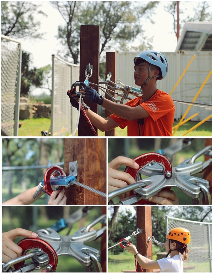 | 在享受這高低索設施最重要的就是如何保護自己的扣環跟鋼索,這一個部份真的要仔細聽從教練的解說,基本上有了安全扣環跟連結鋼索就可以讓你玩的盡興無憂。 |