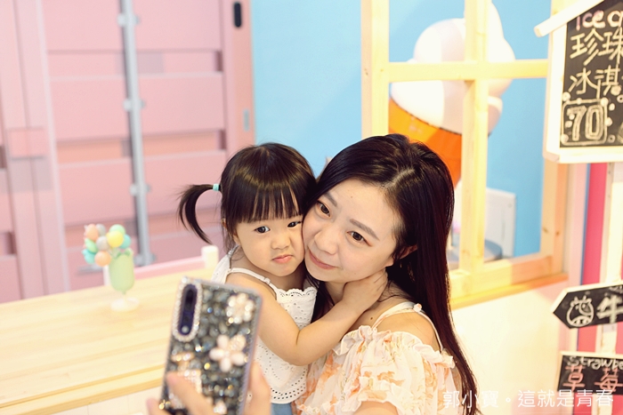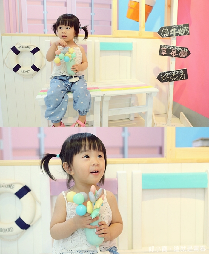 | 老婆大人拍完當然就要換我們家的寶貝上場,Cola還滿捧場的,還會擺出超多姿勢給我們拍,真的太可愛了阿,老闆還熱心的跟我們說可以拿一旁的桌子讓妹妹墊腳,高度完全剛剛好啊xddd |