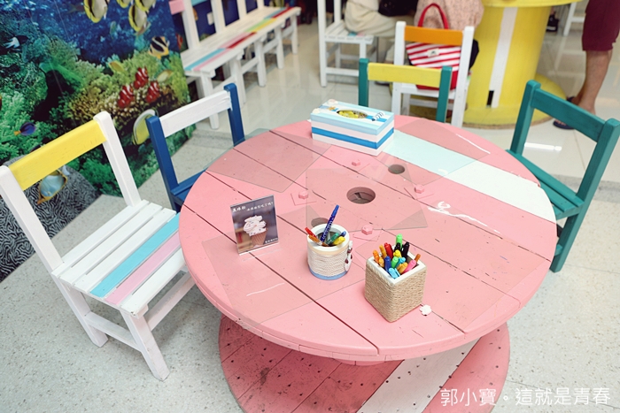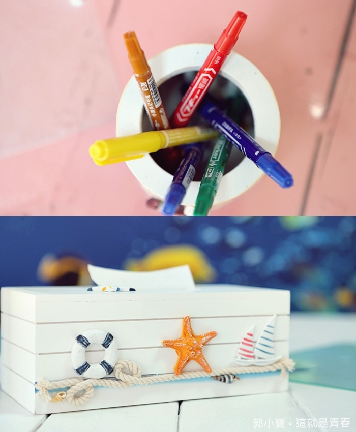 | 桌上備有畫筆,可以在卡片上還有貝殼上作畫帶回家當紀念品,連面紙盒都打造的超有海洋風格,濃濃的感受到墾丁的氣息,唯一不同的就是這邊有涼涼的冷氣XD |
