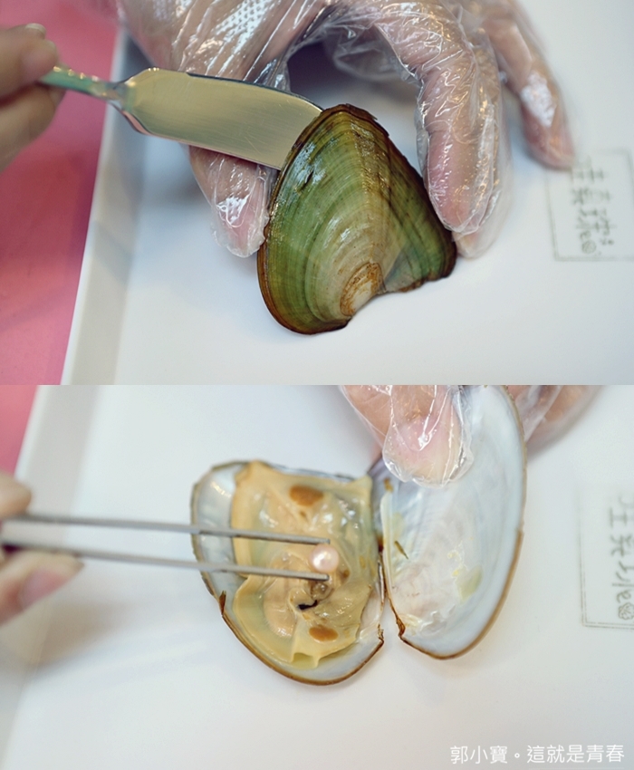 | 利用抹醬刀將貝殼打開後,再用夾子輕壓蛤肉,壓到硬硬的地方後再用力將珍珠擠壓出來,用力擠壓下就可以看到珍珠從蛤肉裡面蹦了出來,真的還滿有趣的。 |