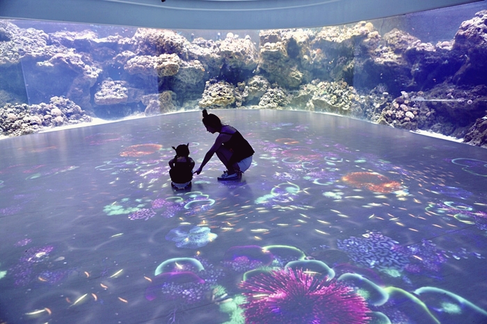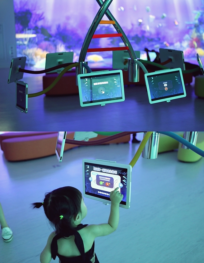 | 二樓的互動區也是小朋友的聚集地,透過平板互動讓小朋友能學習到更多的海洋知識跟樂趣小互動。 |