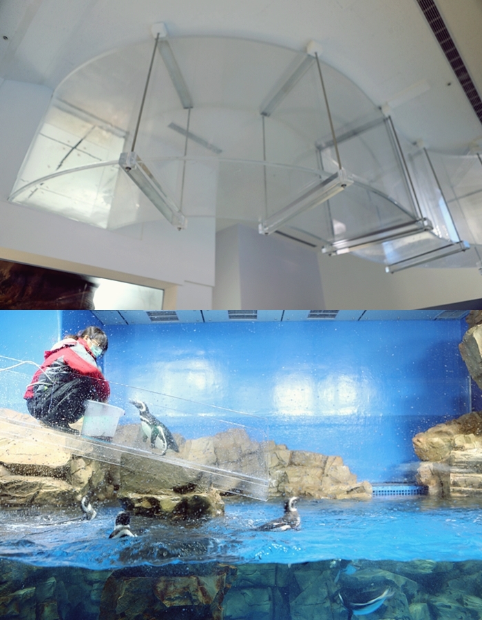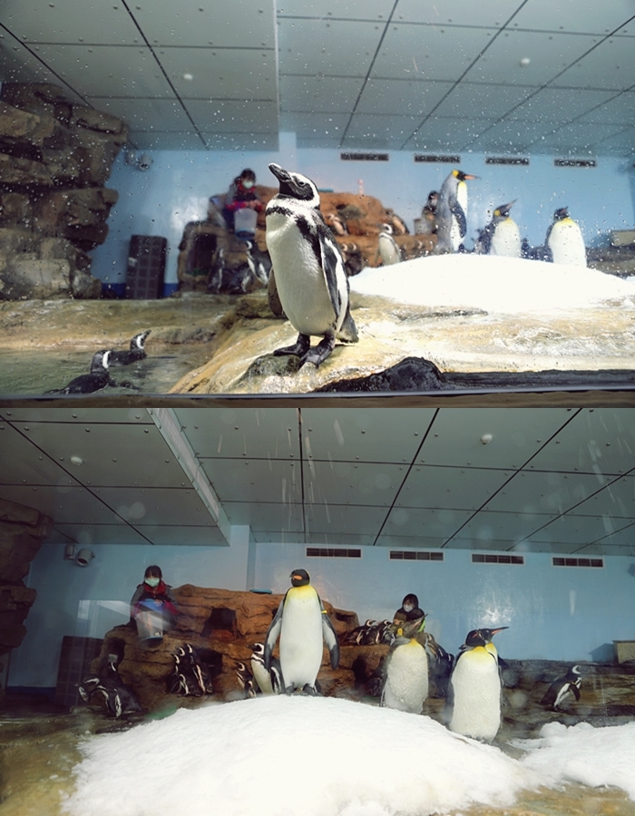 | 上面還有連通道讓企鵝可以自由通往兩邊,餵食秀還可以看到企鵝呆萌搶食的可愛模樣,還會溜滑梯下來跳水真的可愛極了。 |