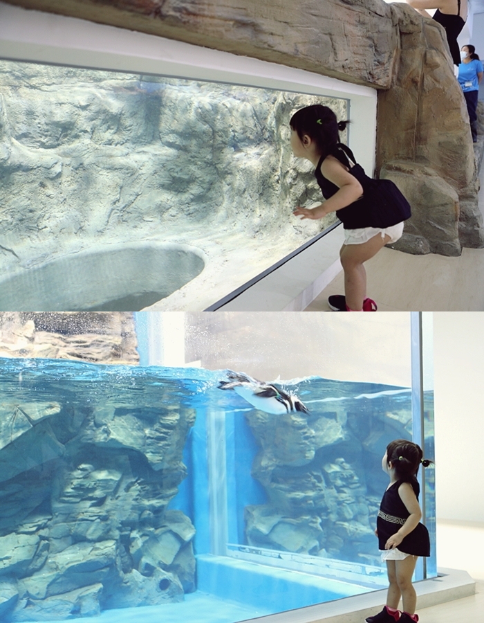 | 可以讓小朋友一整個盡情的看企鵝的地方,有特別設計讓小朋友可以觀賞到企鵝遨遊的姿態,但是家長千萬記得要控制小朋友,別讓小朋友拍打玻璃,以免驚嚇到企鵝們。 |