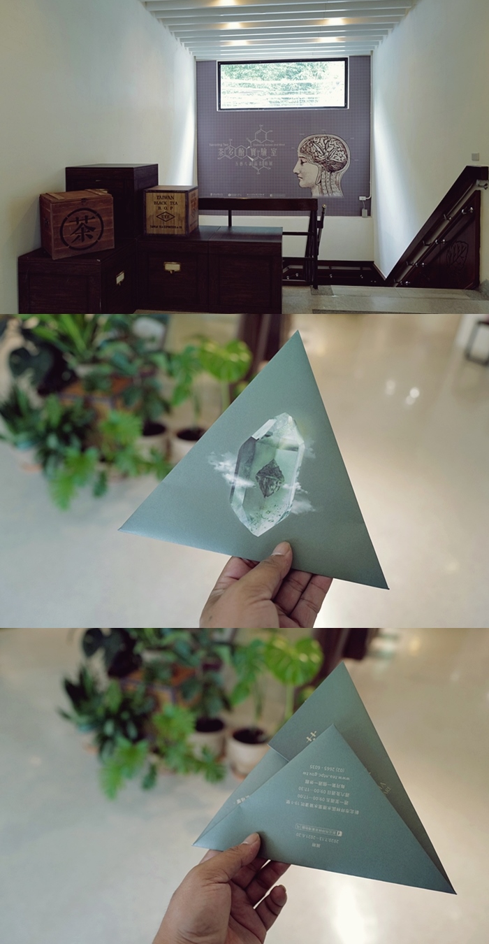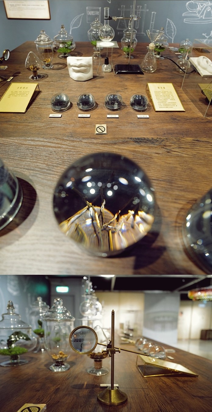 | 看完了一樓的特展,可以轉往地下室看看茶博館另一個特展茶多酚實驗室,然後我只能說茶博館的工作人員太有才了,連DM經過他們的巧思,摺起來都那麼的有創意,水晶裡面的茶山真的很有意境。 |