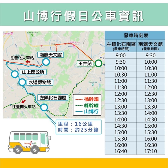 山博行線在假日的班次非常密集,且途中經歷的四個站點都非常紅,左鎮化石園區跟南瀛天文館還有水道博物館都是這兩年台南最夯的景點,但是要注意的一點是山博行線沒有從台南火車站發車唷!!!