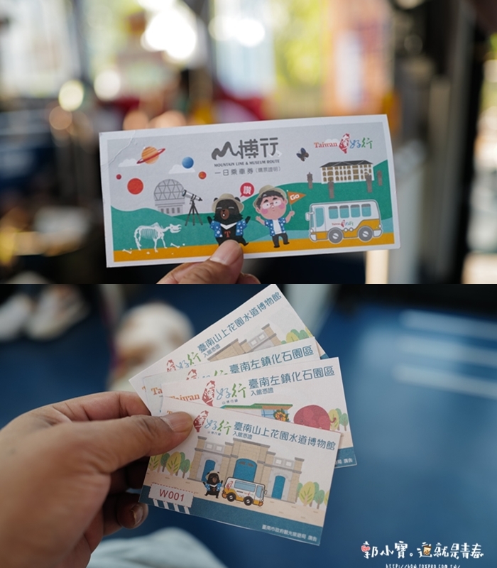 • 台南火車站出發使用台灣好行山博行線車票(已含綠橘幹線去回程免費轉乘優惠服務)至臺南火車站興南客運公車(北站)請站務員蓋啟用章,搭乘「綠幹線」並於上車後出示已蓋章車票即可搭乘至左鎮化石園區再轉乘山博行路線。