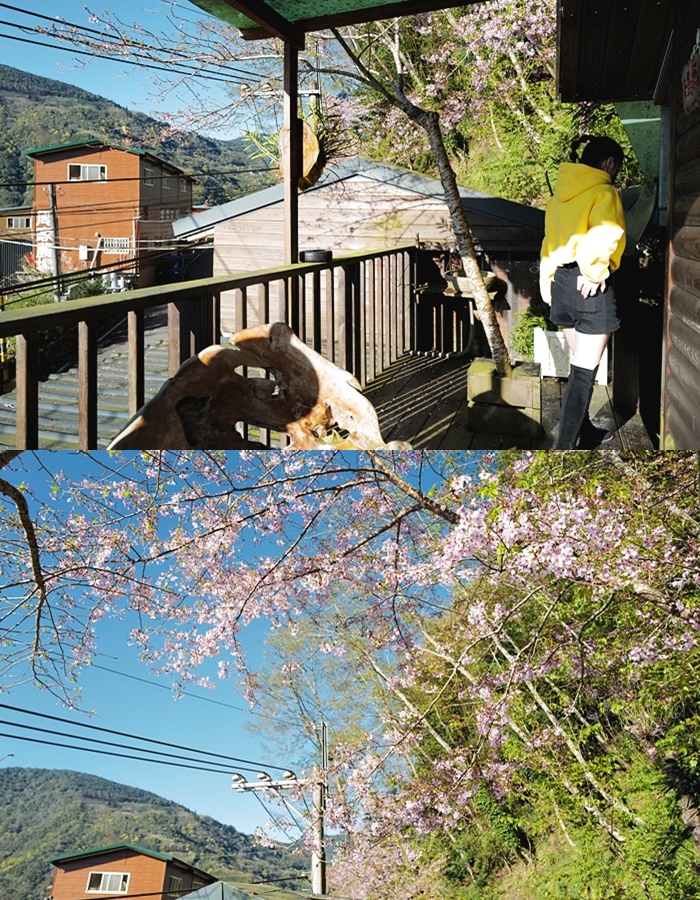 | 放好行李後我們馬上下樓去旁邊玩,因為上山的時候有看到雲棧旁有一整排的櫻花樹,然後因為這邊的櫻花已經開始落了,所以變成一整片都是櫻花海,從這個角度看雲棧也很漂亮。 |