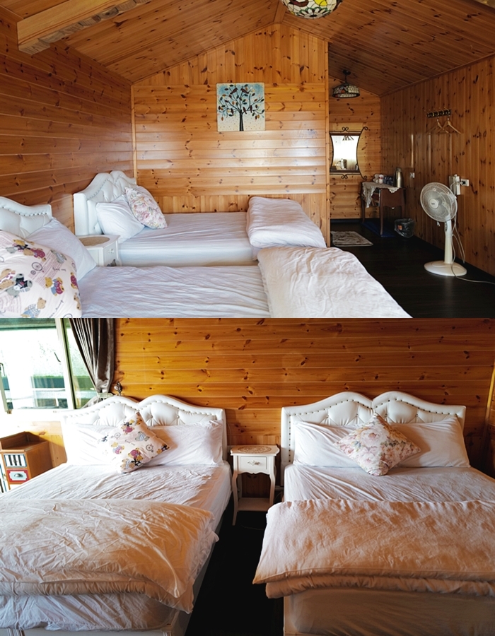 | 屋內也是全部都是木頭打造,一進入房內就可以聞到木頭的香氣,四人房雙人大床墊非常舒服也很好睡,因為山上的早晚溫差非常大,所以都有準備電毯,當天晚上真的冷到吱吱叫,但是電毯真的超級溫暖,根本捨不得離開床上,一整個超好睡。 |