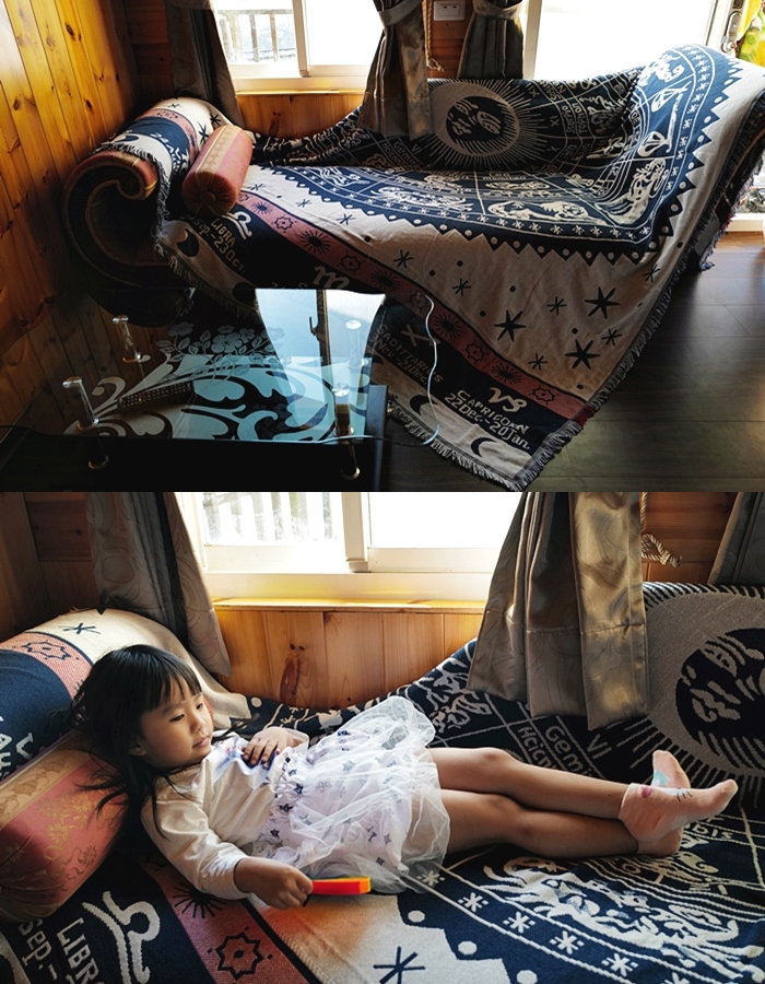 | 門口旁還有一座太妃椅,躺在這邊剛好可以看到窗外的櫻花美景,簡直太爽了,根本就網美的位子,看我們家Cola一整個超舒服的。 |