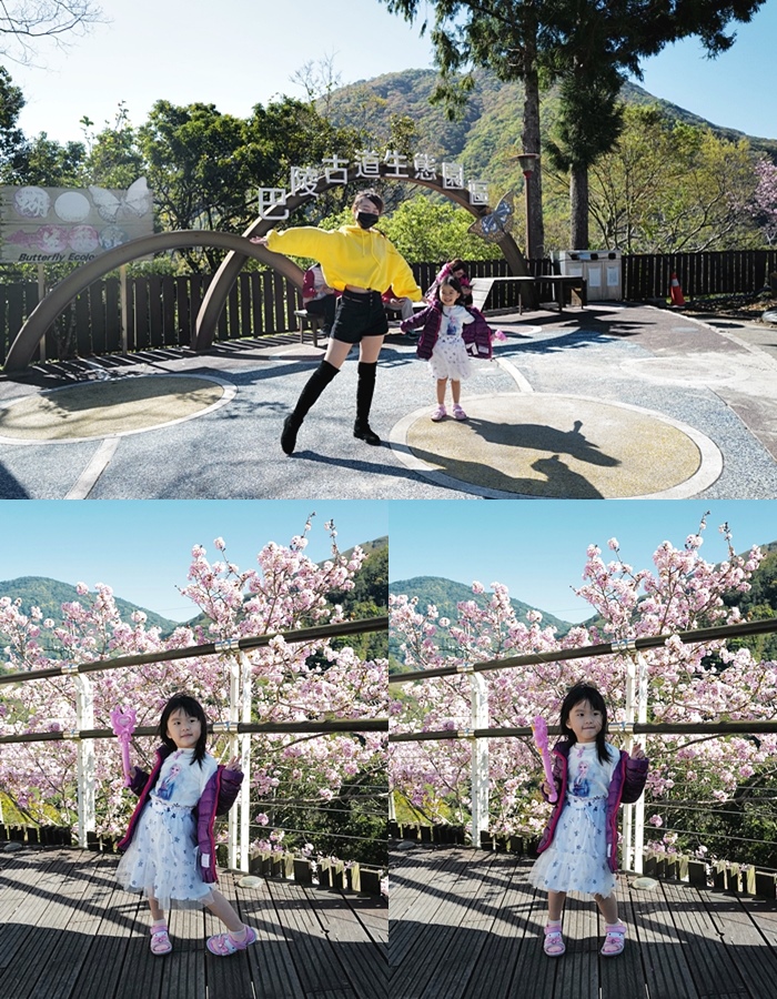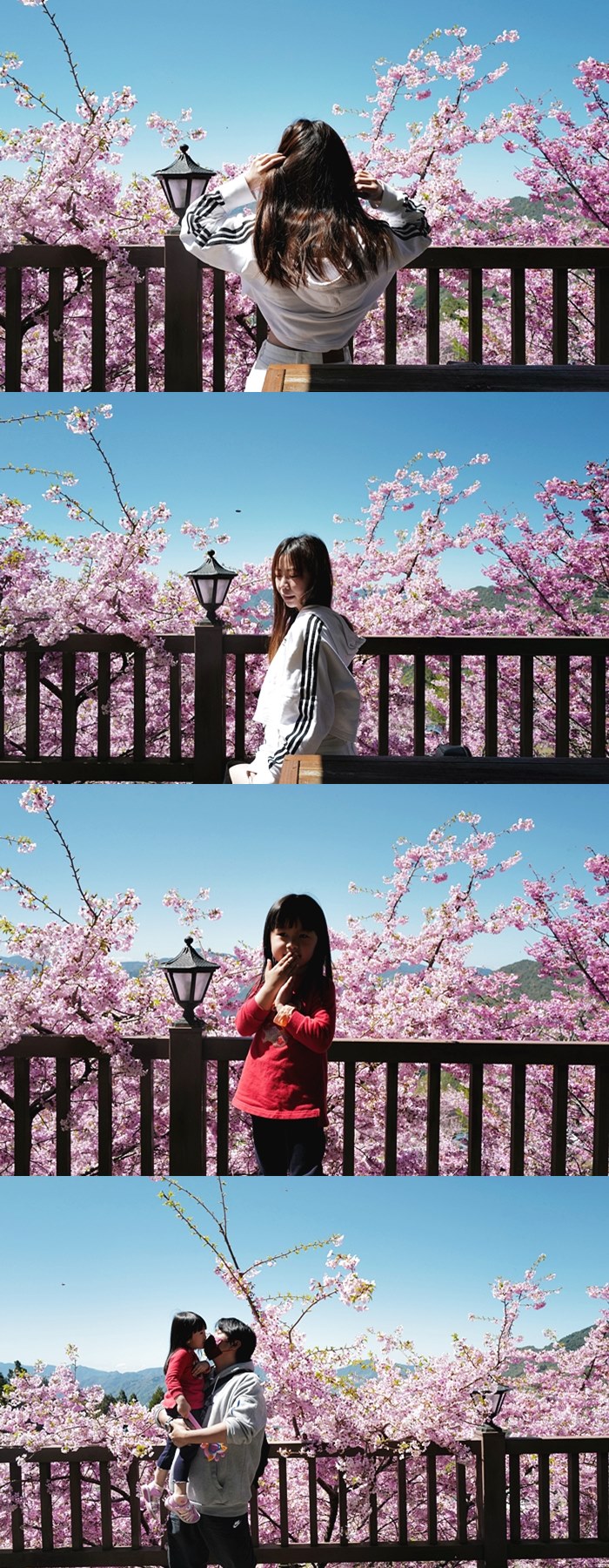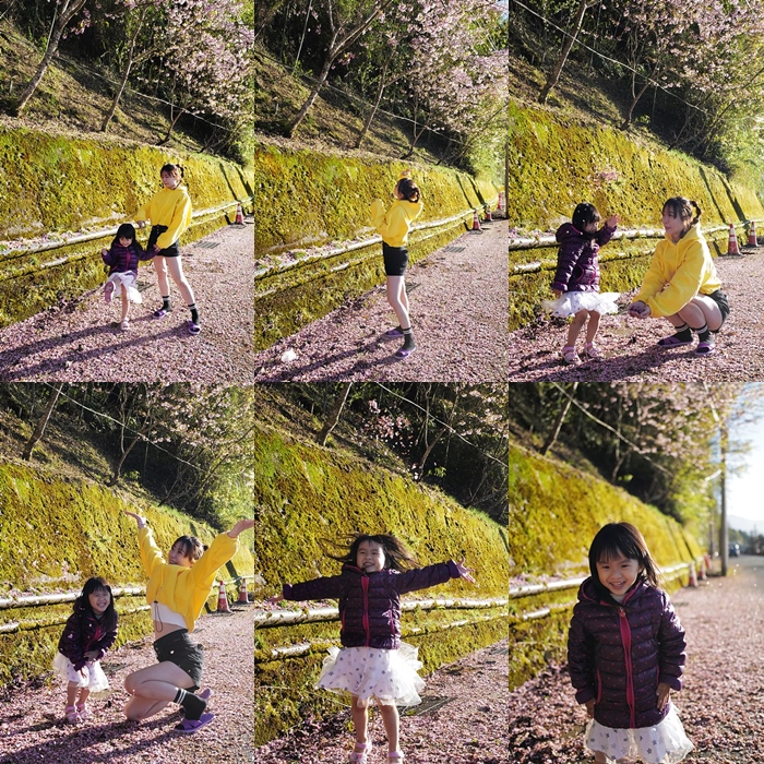 | 滿地的櫻花像極了櫻花地毯,一家人在這邊拍美照灑櫻花真的玩的超開心的,這麼一大片的櫻花地毯真的也太美了,連太妃一看到雲棧旁邊有櫻花地毯開心到連鞋子都來不及換就穿著拖鞋跑下來拍照。 |