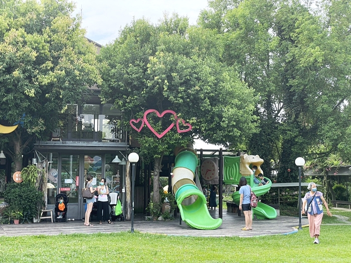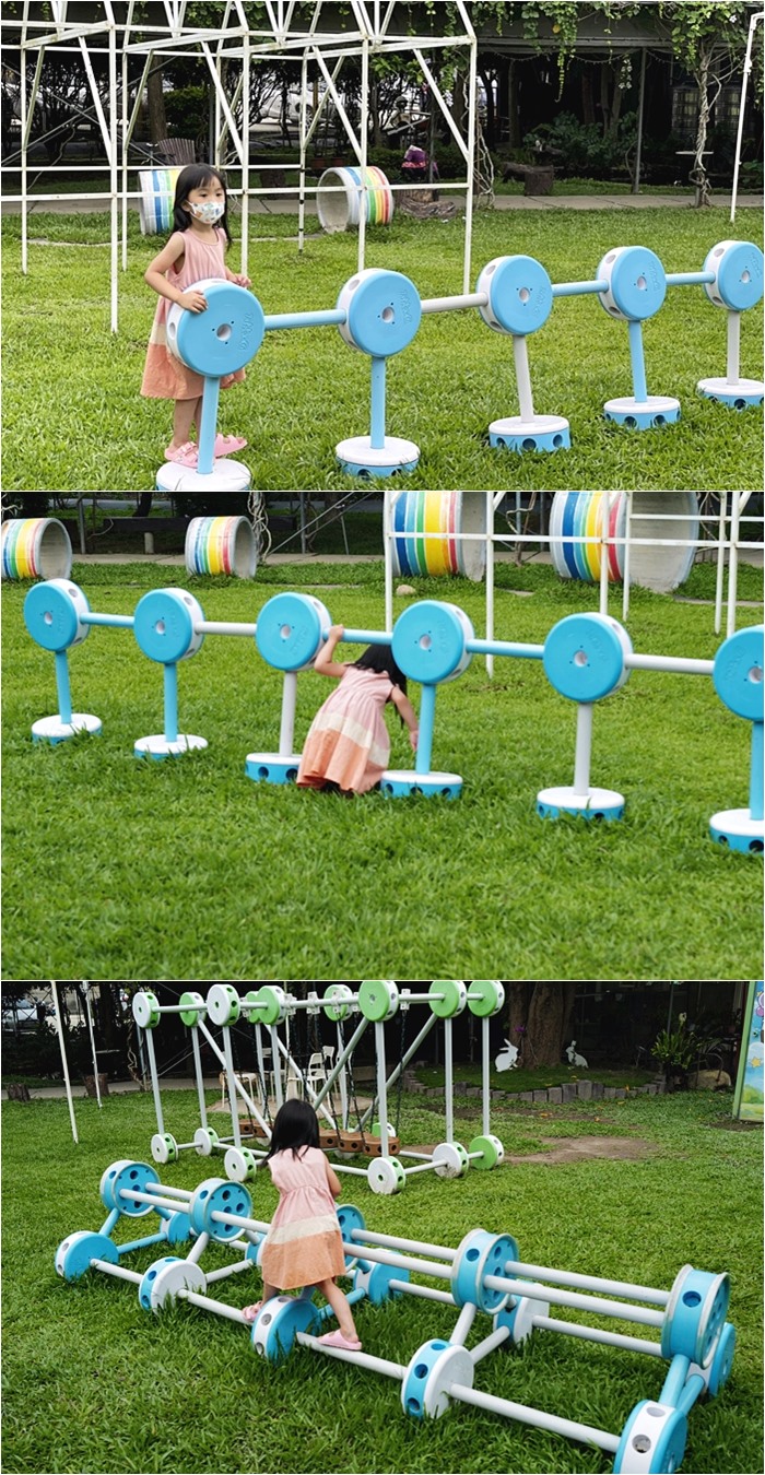 | 光是大草皮的遊具就讓我們家Cola沉迷了一兩個小時了,這還只是前面的大草皮,赤腳ㄚ生態農莊整個腹地算是還滿大的,遊樂的空間也超多樣,非常豐富。 |
