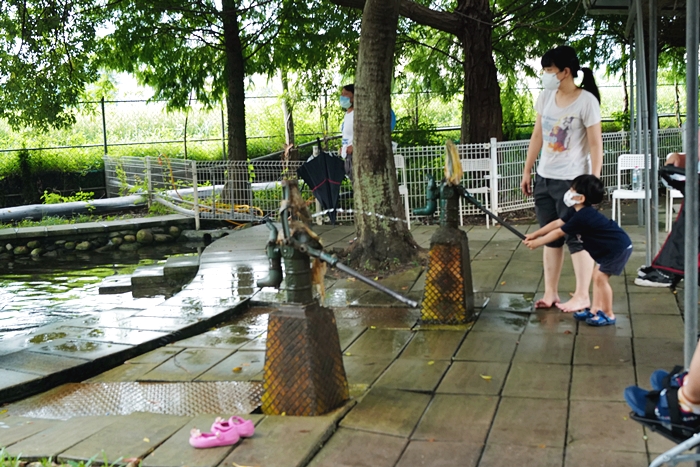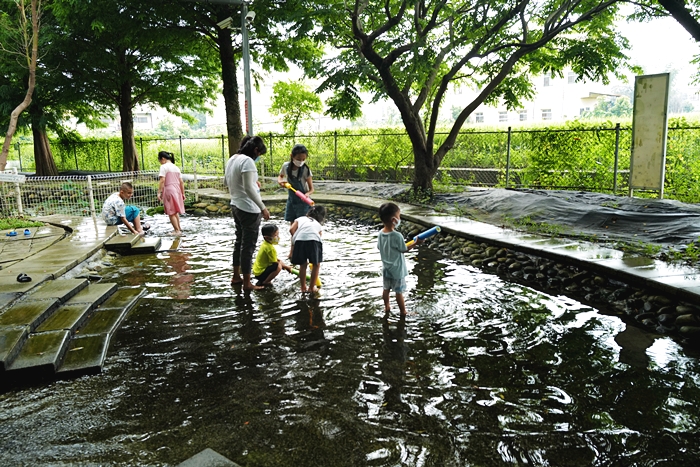 | 這邊竟然也有戲水區可以讓小朋友消暑一下,戲水區的深度不深,連小小朋友都可以下水,最主要讓小朋友玩水槍踏踏水,戲水區也有遮陽物,夏天來很適合。 |