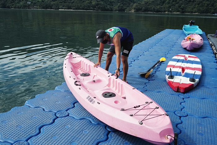 全部都著裝完畢後,教練救會幫忙把獨木舟推下湖理,並且協助遊客上船,他們家的粉紅色的獨木舟超粉嫩又吸睛。