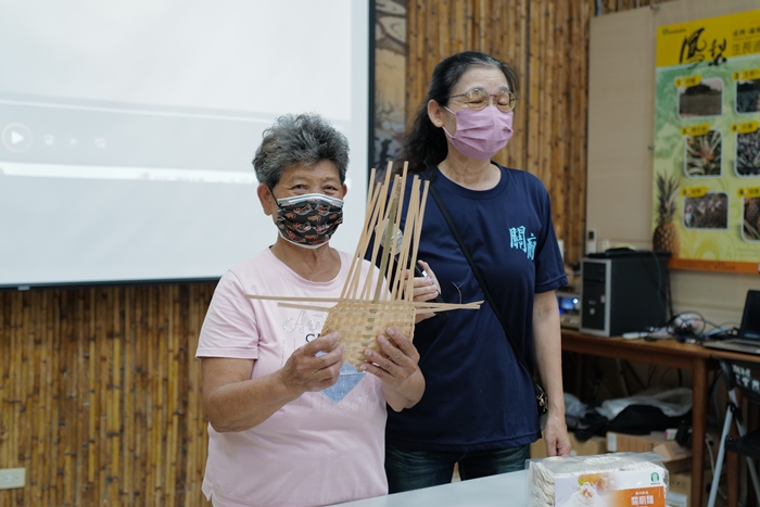 | 接下來就是進行關廟區另一個手工藝,竹編,竹編在關廟也是歷史悠久的一項產業,具導遊說以前在台灣製作竹編的兩大鄉鎮就是關廟跟竹山地區,當場還請來了數十年經驗的奶奶來教大家製作竹編扇。 |