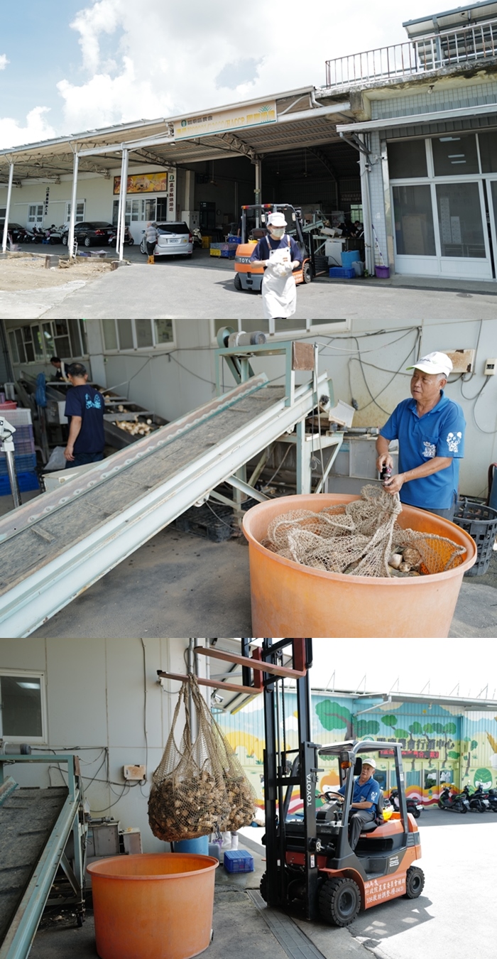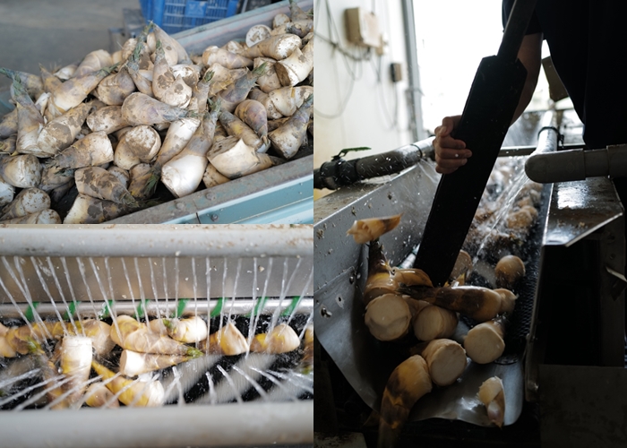 | 一車車的綠竹筍運送進來後馬上進入流水線,經過挑選清洗的流程。 |