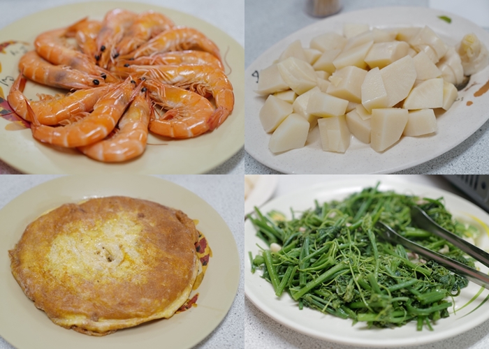 菜脯蛋、白醋蝦、白醋筍(沙拉筍)、炒時蔬